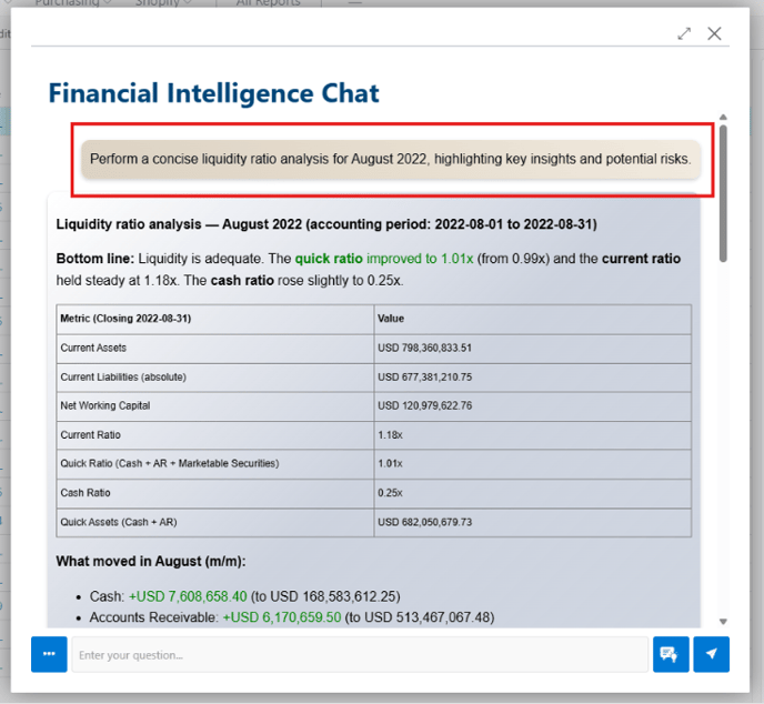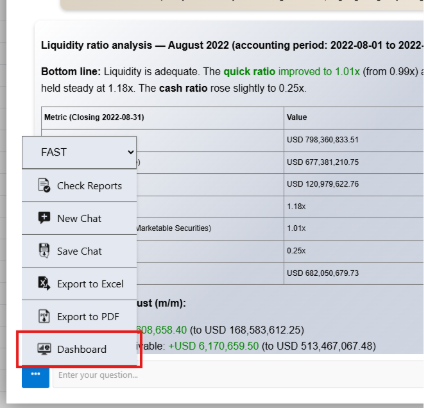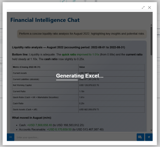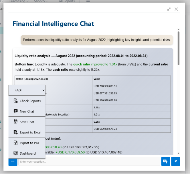 The FineChat v1.0 functionality has been introduced in version 1.0.2.6 of the Financial Intelligence package. It enables a conversational interface between the user and the AI. Based on the user's initial query, the system automatically selects and generates the necessary reports. The process is largely automated—initiating a query starts an end-to-end interaction where the user builds a complete conversation with the AI.