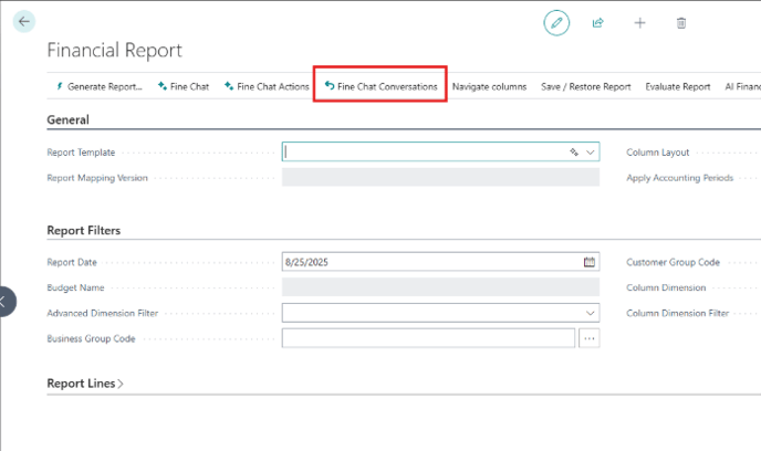 A new Fine Chat Restore button is available on the Financial Report page under the Evaluate Report tab. It allows users to load previously saved conversations.