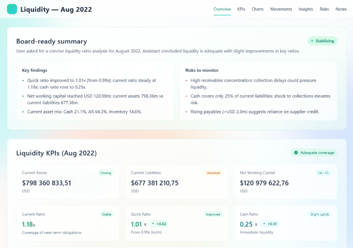 At this stage, layouts for the selected reports are generated automatically. The number and type of reports depend on the question asked. These generated reports form the foundation for the conversation. If the question involves data not present in the current context, the system prompts the user to reset the session.
