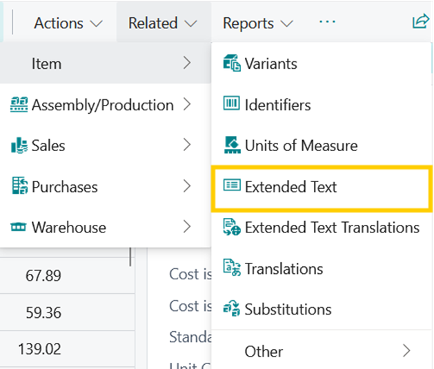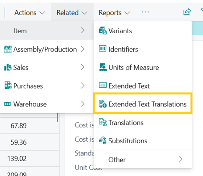 In the Items taskbar, navigate to: Related → Item → Extended Text Translations.